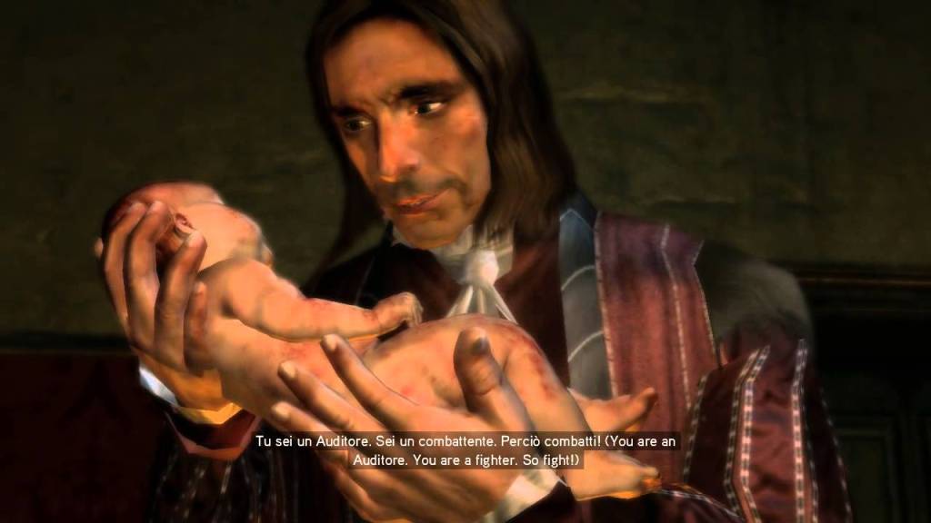 We see the entire life of Ezio run in front of us. He is born in front of us; we see him struggling to breathe right after he’s born. We witness his father naming him Ezio Auditore. “You are an Auditore, You are a fighter, so fight!” his father says while we press the keys to move infant Ezio’s limbs, we help him fight. We are instantly connected to that infant.
